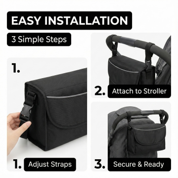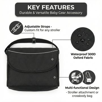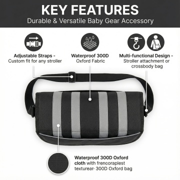 这是一款可以挂在婴儿推车推把的一个置物袋,配备有调节扣可调节背带的长短,还可以用做一个单肩妈咪包。帮我生成一套亚马逊主图,面料是300D牛津布