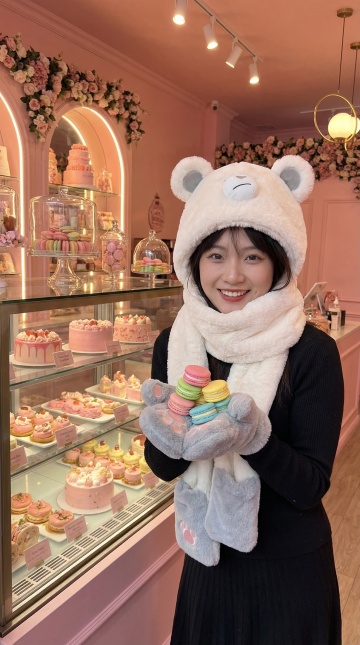 暖调灯光下的咖啡馆,女孩身着柔软毛衣与格纹裤,搭配手账风笔记本与动漫草图墙,营造出温馨、舒适又文艺的氛围。