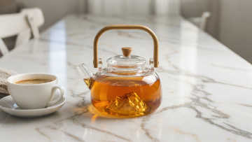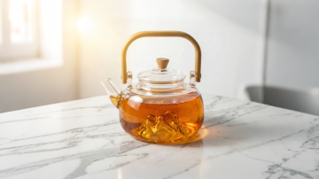 生成一张特写图,精致的[养生茶饮]放在办公桌上,旁边有电脑和绿植,阳光洒下,氛围轻松。