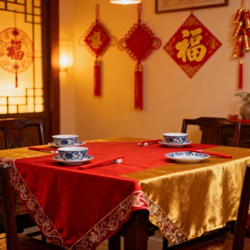 热气腾腾的鸳鸯火锅冒着浓郁香气,锅中翻滚着鲜红的麻辣汤底和清亮的菌汤,周围摆满肥牛卷、虾滑、毛肚、青菜等各色食材,木质餐桌上铺着传统花纹餐布,背景是古色古香的中式屏风和红灯笼,营造出温馨热闹的火锅盛宴氛围,整体呈现出温暖诱人的色调和丰富的层次感,充满地道的中式火锅文化气息。