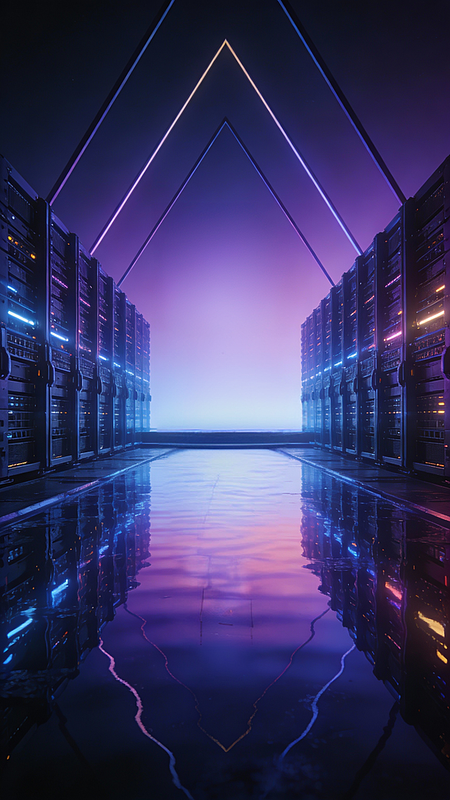 深紫色与亮粉色渐变的科技感背景,垂直排列的发光几何线条与六边形网格结构,底部是发光的紫色电路板纹理地面,中央有明亮的粉色光源向上扩散,整体呈现出深邃神秘的赛博朋克风格,线条流畅锐利,光影对比强烈,充满未来科技感与空间纵深感。详情