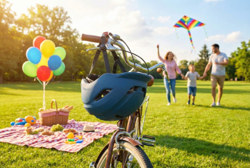 清新自然的山野实景中,现代感十足的蓝绿色自行车静立草甸,金属质感与光影交错,轻拟物设计融合浮雕细节,展现科技与舒适并存的骑行美学。