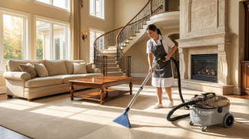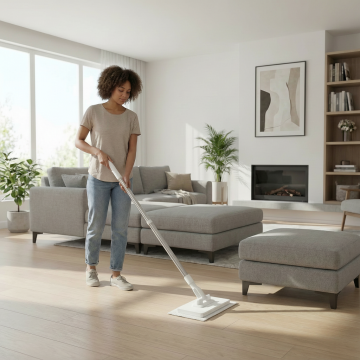 明亮的现代办公室环境,柔和的自然光透过大面积玻璃窗洒入室内,温暖的木质办公桌,桌上放着笔记本电脑、打开的笔记本、蓝色马克杯和一支铅笔,穿着米色开衫与白色衬衫的女性正在专注地使用笔记本电脑,背景有白色书写板、木质书架和简约办公家具,整体风格简约、专业、温馨,具有清晰的空间层次感和舒适的工作氛围,高清晰度,写实摄影风格,柔和光线,自然色彩。