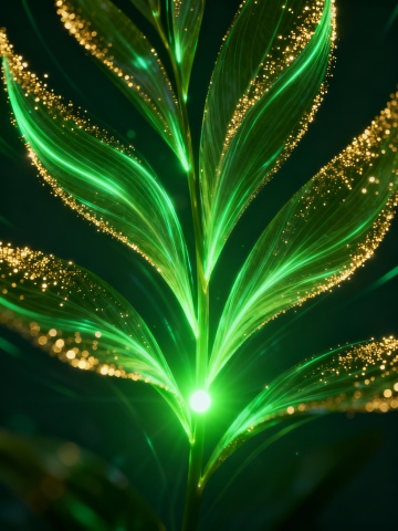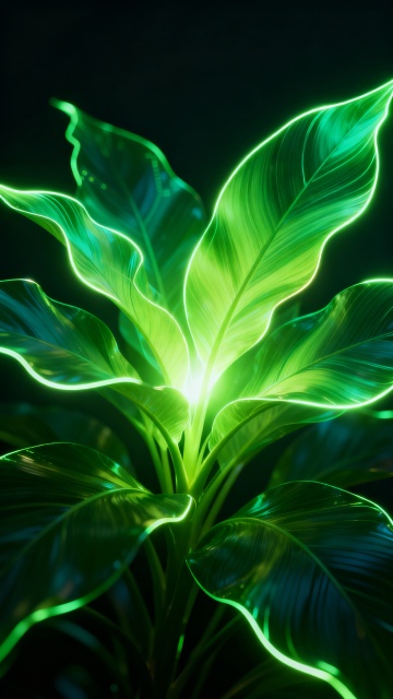 霓虹灯风与描边风融合,3D质感的虚拟自然植物在光影中散发未来感与梦幻感,清透绿光勾勒叶脉,酷炫科技感十足。