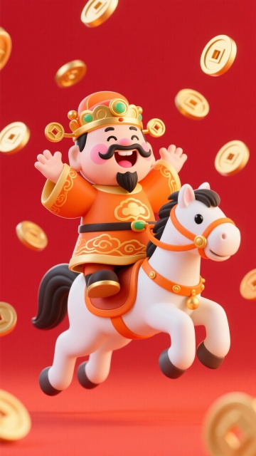 3D卡通财神,拟人化设计,鎏金服饰,喜庆氛围。