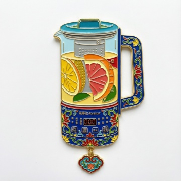 把图示的产品,做成金边珐琅金属冰箱贴,周围有水果点缀,不改变其他产品细节