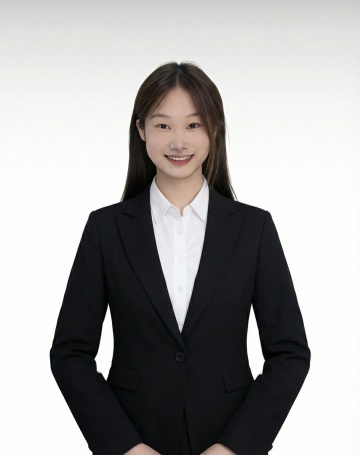 参考图一生成画面:证件照标准样式;保留人物发型和脸型特征,不美颜,外穿奶白米色学院风针织背心,内搭白色翻领长袖衬衫,背心领口有深蓝色、白色和浅灰色条纹装饰;领口处搭配深色格纹领带,淡妆,发丝柔顺有光泽;居中平视正面视角,纯正面,胸部以上半身像;去除一切饰品;光线均匀柔和,画质清晰,表情自然,头部完整,去除人物之外的所有元素,简约白色背景;参考图二的人物占位和比例,严格按照图一的内容生成。