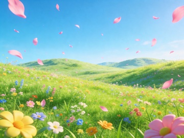 清新文艺风格插画,澄澈如洗的薄荷蓝天空下,无垠的嫩绿色草地如丝绒般铺展至天际,一位身着象牙白棉布裙、手持柠檬黄雨伞的小女孩正轻盈奔跑,伞沿滚落的水珠在阳光下折射出细碎彩虹,身后赤着上身的男孩穿着靛蓝色短裤,麦色皮肤上沾着草叶的露珠,他张开双臂追逐着前方飘动的白色裙裾,远处地平线处有几朵蓬松的蒲公英正在起飞,整个画面沐浴在清晨9点的柔光中,青草与湿润泥土的气息仿佛从画中溢出,构图采用低角度仰拍的远景视角,让奔跑的身影与广阔天地形成充满希望的比例关系。