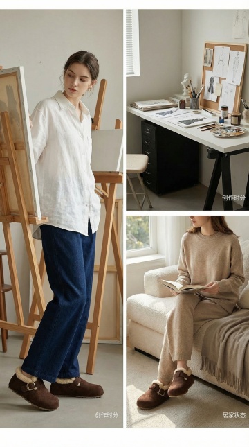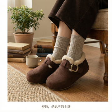 鞋子状态: 安静地、随意地搁置,鞋口向内微卷,露出柔软的水晶绒内里,强调“归属”与“放松”。