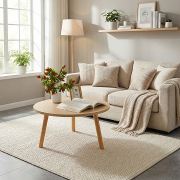 明亮通透的北欧风格室内场景,柔和的自然光透过双层窗帘(内层白色纱帘、外层米色亚麻遮光帘)洒满整个空间,温暖的木质地板搭配浅色毛绒地毯,靠窗摆放简约米色布艺沙发,沙发旁设有造型独特的原木茶几,上置几本书籍、咖啡杯和插有粉色花朵的透明玻璃花瓶,角落处有一盆大型绿植增添生机,整体色调以米白、浅木色为主,营造出宁静舒适、自然清新的居家氛围,光影层次丰富,细节质感细腻。