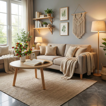 极简风装修室内场景,浅灰色布艺沙发配米白色靠垫,原木色细腿小茶几上放着插有干花的透明玻璃瓶,沙发前铺着米色编织地毯,浅灰色墙壁悬挂白色编织纹理吊灯,整体以浅灰、米白、原木色为主色调,光线柔和明亮,空间宽敞留白,线条简洁流畅,材质注重自然质感,营造宁静、舒适、简约的居住氛围,无任何多余装饰元素。