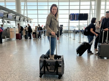 一个打开的绿色行李箱,内部整齐地铺着白色衬布和绿色条纹衣物,旁边放着白色眼罩、绿色方块物品,行李箱外散落着米色皮质收纳包、黑色相机、米色笔记本、白色太阳镜、草帽、香水瓶、口红、黑色小皮件和印有飞机图案的蓝色卡片,整体采用简约清新的摄影风格,明亮柔和的自然光从上方照射,形成清晰自然的阴影,色调以绿色、米色、白色为主,营造出轻松愉悦的旅行氛围,画面构图讲究,物品摆放有序,具有强烈的生活美学感和精致的收纳展示效果。