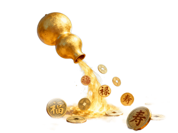 中式喜庆风格,鎏金3D立体“發”字辉映红底,搭配浮雕质感金元宝与铜钱,毛绒装饰点缀,尽显奢华重拟物风,传递新春财运亨通之寓意。