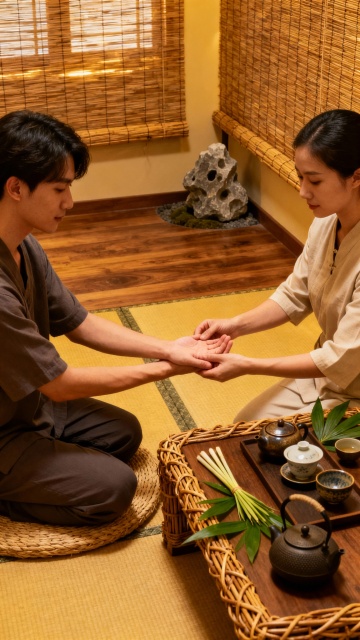 写实风格摄影,画面整体采用柔和的靛蓝色与暖橙色对比色调,一位约四十岁左右的中年男子,身着象牙白传统中式长衫,正专注地在古朴的木质茶桌前进行茶道仪式,他手持茶勺,神情沉静而专注,眼神温和。背景是深色木质博古架,上面整齐摆放着多个靛蓝色与橙色渐变的陶瓷茶罐,左侧悬挂着一盏散发暖橙色光芒的中式纸灯笼,灯笼上有模糊的书法文字。茶桌上摆放着靛蓝色的茶碗、深色陶制茶炉、茶则、茶针等茶道器具,还有一本打开的线装古籍。整体光影柔和,侧逆光勾勒出人物的轮廓,营造出宁静、典雅而略带现代感的氛围,画面构图遵循三分法,人物位于右侧黄金分割点,前景茶具清晰,背景书架稍显虚化,形成自然的景深效果,色彩和谐统一,细节丰富,质感细腻,展现出传统茶道文化的韵味与中年男子沉稳内敛的气质。