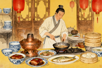 【中国传统美食系列素材集合】纯色背景,扁平化设计风格,整体采用高饱和度暖色调(红色、橙色、黄色为主),画面中包含多种中式菜肴,有炖品、炒菜、点心、汤羹等,各类菜品用不同形状和颜色的餐具盛放,餐具设计简约现代,所有元素规整排布,形成有序的视觉节奏,无文字信息,适合作为餐饮相关的系列素材使用。