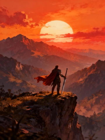 二次元动漫风格立绘,白色背景,一位身着红色与黑色为主色调华丽服饰的女性角色,她有着金色的长发,头戴带有红色宝石的黑色发冠,眼神锐利而自信。上身为黑色紧身露肩上衣,点缀金色花纹,外披红色金边披风,披风边缘有毛绒装饰。下身为高腰红色短裙,裙摆呈不规则层叠设计,搭配黑色过膝长靴,靴筒有金色扣带。手中持有一把燃烧着红色火焰的长剑,剑柄华丽镶嵌宝石。整体造型充满力量感与高贵气质,线条流畅,色彩对比强烈,光影效果突出,人物姿态挺拔,微微侧身,一只手握着剑柄置于身侧,另一只手自然下垂,披风随风飘动,展现出动态的美感,细节丰富,服饰质感细腻,具有浓厚的奇幻战斗风格。
