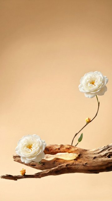 柔和的米色与浅棕色渐变背景,前景中一块纹理粗糙、带有自然裂痕的深棕色原木横置,几枝开着洁白五瓣小花的细枝从木头上延伸出来,几朵花瓣散落在木头前方的浅色平面上,整体呈现出细腻的水墨风格,线条流畅,墨色浓淡相宜,保留原木的沧桑质感与花朵的清雅姿态,光影柔和,营造出宁静悠远的东方禅意氛围。