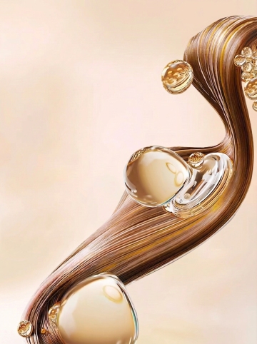 一张符合超写实3D渲染风格的精华液流体图片,画面中半透明大油滴包裹小分子结构和气泡,周围环绕金色波浪状液体与悬浮小油珠,整体营造出奢华、水润、科技感的氛围。