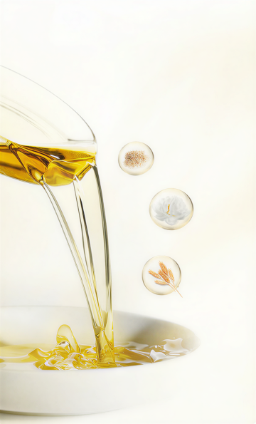 高清美妆分子动感背景,透明金色油状液体形成流畅飘逸的波浪形态,中心悬浮着包裹分子结构(由多个小圆球通过线条连接构成)的透明大油滴,周围散落着大小不一、带有高光和折射效果的金色油滴与气泡,整体呈现出轻盈灵动的流动感,采用柔和的米白色渐变背景,适当面积留白以增强空间感和高级质感,光影柔和,高光细腻,色彩以金色和透明色为主,营造出纯净、高端、科技感的美妆氛围。