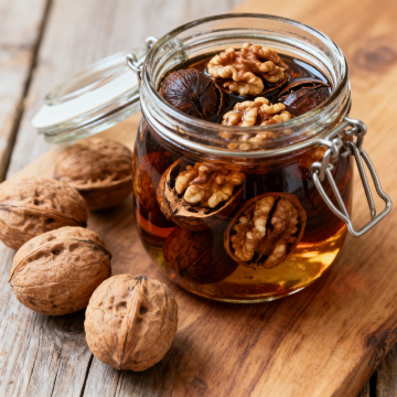 木雕风质感的核桃散落于木质桌面,浮雕般的纹理与柔和光影交织,营造出质朴自然的实景感,传递温暖舒适的生活气息。写实风格的核桃背景,浅棕色木质桌面上散落着不同形态的核桃,前景是多颗饱满的金黄色核桃仁,纹理清晰,外壳呈自然的浅褐色,表面有细微的凹凸纹路,背景有几颗完整的带壳核桃,整体光线柔和,侧光照射形成自然的阴影,色调温暖统一,营造出质朴、原生态的氛围,画面构图饱满,核桃分布错落有致,突出核桃的质感和