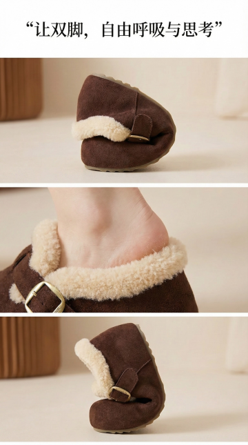 视觉: 浅焦镜头。一双 秋栗色 勃肯鞋被随意但美观地放置在一张老旧橡木书桌的边缘。背景虚化处,有一摞翻阅过的旧书、一个简单的白色陶瓷咖啡杯,以及一缕透过百叶窗的柔和阳光,在桌面投下斑驳光影。鞋子是绝对焦点,占据画面中心,环境元素仅作为氛围衬托,极其克制。 氛围/文字: 极简、真实、安静。可配一句最小字号的文案,如:“给双脚的阅读时间。” 目的: 第一眼建立产品“知识分子风”的安静、舒适、有内涵的格调印象,吸引目标客户停留。
