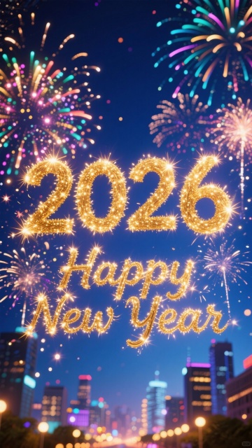 鎏金大字闪耀夜空,粒子光效交织烟花,3D立体字营造梦幻光影感,城市夜景衬托喜庆氛围,新年祝福跃然眼前。
