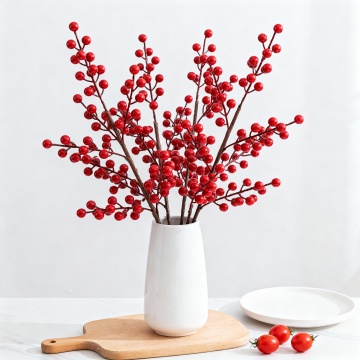 简约主义风格,红果枝条与白瓷花瓶构成清新喜庆画面,木质砧板增添质朴感,轻拟物风呈现节日氛围。