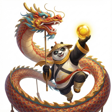 卡通感熊猫拟人化设计,扁平风配色鲜明,极繁主义细节隐藏于表情,印刷风质感突出,节日氛围浓郁。