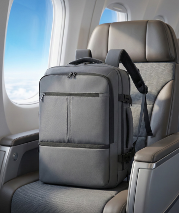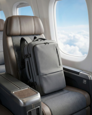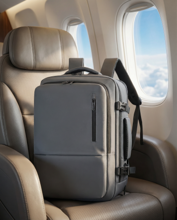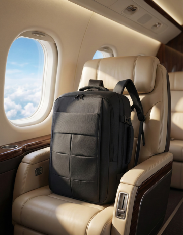 以写实风格呈现,图片中的主体放置于头等舱座椅上,窗户外面是蓝天白云。突出主体物的主体地位,保留所有物体的细节特征,整体画面注重色彩和谐与光影层次,体现出高端。