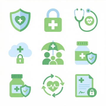 一组6个完全不同医疗健康类目的图标集合,保持统一的简约扁平风格,每个图标都有清晰的线条轮廓、简洁的色块填充和轻微的渐变阴影效果,整体画面色彩变换为清新的蓝绿色调,所有图标规整地排布在纯色背景上,类目分别为:听诊器、药瓶、心电图、手术刀、注射器、血压计。