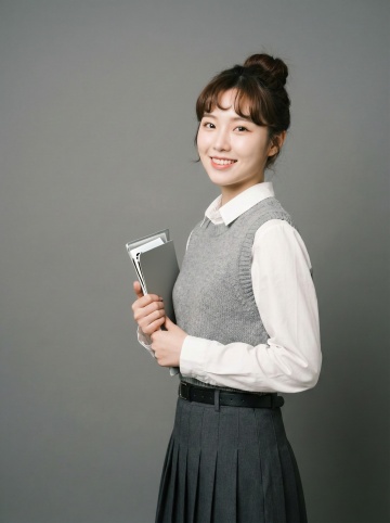 一位年轻亚洲女性的全身人像,人物正面站立,双手背在身后,姿态自然,表情平静。采用高清商业摄影风格,柔和均匀的正面光源,白色纯色背景,画面干净简洁,主体突出。人物展示完整,包括发型、面部表情、身形姿态。穿搭改为简约时尚风格:上身是一件浅灰色的宽松短款卫衣,搭配一条高腰深蓝色直筒牛仔裤,脚穿白色运动鞋,整体休闲舒适,符合日常穿搭展示需求。