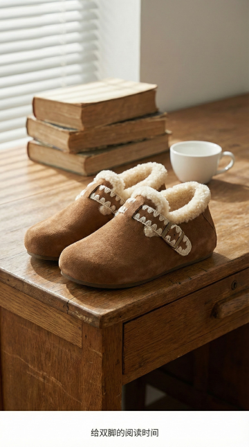 视觉: 中景。女模特(仅露下半身至小腿)身穿米白色针织袜套和宽松的亚麻色居家裤,赤脚穿着秋栗色勃肯鞋。她双脚踏在一条柔软的羊毛地毯上,身体放松地靠坐在地面靠垫旁,身旁散落一两本摊开的杂志。焦点在鞋子与松弛的脚部状态。 氛围: 舒适、私密、放松。文案可无,或配:“在家,在属于自己的节奏里。”