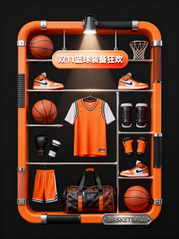 3D重拟物风篮球装备陈列,工业金属框架搭配橙色主题,强化促销感,双11节日氛围浓厚。