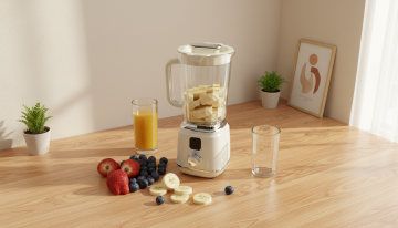 动漫风格插画,明亮自然光从左侧照射,米白色墙面,墙上挂着棕色木质相框的抽象装饰画,画中是米色和棕色的柔和曲线,下方是米白色布艺单人沙发,沙发上放着一个橙色靠垫,沙发左侧有一盆大型绿植,叶片宽大翠绿,放置在白色花盆中,沙发右侧地面上有一个灰色和黑色相间的小型家用电器,浅色地毯铺在人字形拼花木地板上,整体画面温馨舒适,色彩柔和,线条流畅,细节精致,构图平衡。