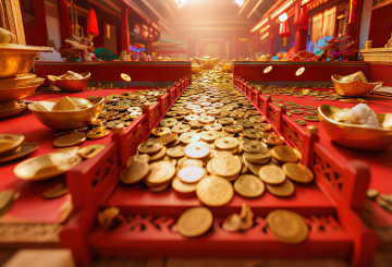 国潮风插画,融合中式建筑与梦幻光影,红月高悬,舞者于鎏金舞台翩跹,水墨云纹铺陈地面,粒子飘渺,营造唯美感与神圣氛围。