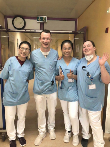 请帮我调整图片内几位护士的面部表情和动作,背景换成其他医疗场景