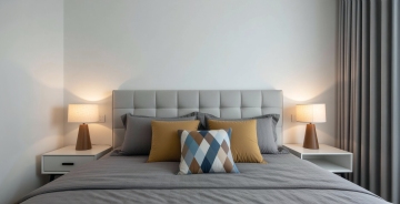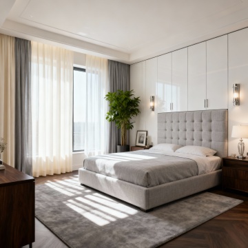 3D渲染的现代简约风格卧室,低饱和度墨绿色与暖灰色为主色调,柔和漫射自然光从右侧大面积落地窗洒入,木质地板温润有光泽,带有细微纹理。画面以床为视觉中心,床头采用浅灰色软包设计与深绿色墙面形成对比,床头两侧是黑色金属支架的玻璃台面床头柜,各放置一盏造型简约的白色球形台灯。床上铺着深绿色与灰色条纹的床单,搭配几个不同材质的灰色抱枕和一条米色针织毯随意搭在床尾。床尾正对着一面悬挂着抽象几何线条装饰画的墙,画框为黑色细边框。左侧墙面嵌入一整面墙的深灰色推拉门衣柜,衣柜底部设计有开放式展示格,摆放着几本精装书和一个小型绿植盆栽。右侧窗边设有一个浅灰色布艺单人沙发,沙发旁是一个原木色小圆几,上面放着一个白色陶瓷花瓶,里面插着几支干花。地面铺着一块浅灰色短绒地毯,地毯上随意散落着一本翻开的杂志和一个编织篮。整个空间光影层次丰富,阴影柔和,营造出宁静舒适且极具现代设计感的休憩氛围,视觉层级清晰,信息传达简洁高效,符合现代都市年轻人群的审美需求。