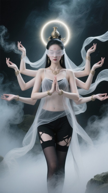 梦幻与神秘交织,中式神女幻化多臂,鎏金光环映衬朦胧光影,3D虚拟现实呈现超现实主义美学,粒子流动间尽显神圣优雅。