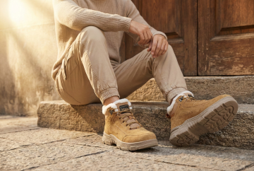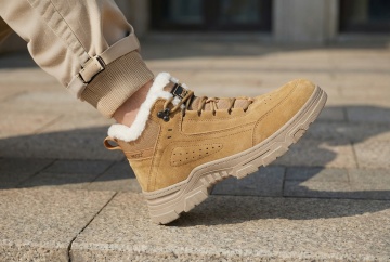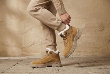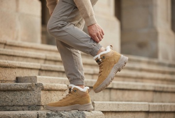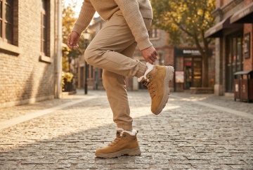 把这双鞋子穿在一个女性脚上,女的穿牛仔裤,背景在城市街头,背景模糊化,天气阳光明媚