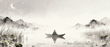新中式水墨风格山水画卷,以柔和的青绿色调为主,远处层叠的山峦在薄雾中若隐若现,近处平静的湖面上一叶扁舟静静漂浮,岸边点缀着几株水墨风格的树木,天空中一群飞鸟自由翱翔,整体画面营造出宁静悠远的意境,构图采用传统山水画的高远视角,留白恰到好处,展现出空灵淡雅的东方美学韵味。