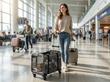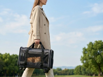 图片产品为宠物航空箱包,生成一张比例为4:3的外国女性单肩背着着图片中宠物航空箱包在走路里面有一只小猫,要求真实自然,产品不变。
