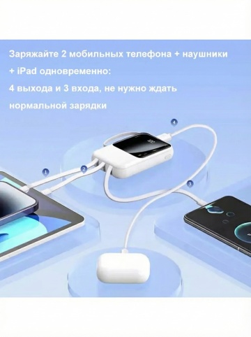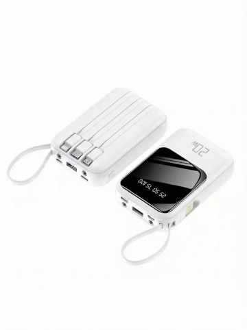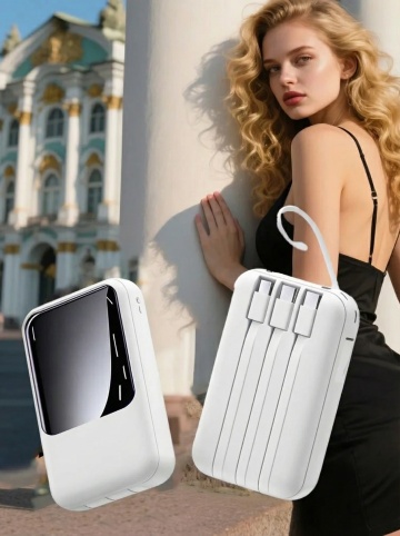 一个简约现代风格的白色充电宝,采用光滑细腻的哑光材质,边缘圆润处理,正面有品牌logo和四个电量指示灯,底部配备两个USB-A接口和一个USB-C接口,轻盈悬浮在流动感十足的白色丝绸背景上,背景采用柔和的浅灰色渐变,整体画面干净通透,光线从左上方柔和照射,在充电宝右侧和丝绸褶皱处形成自然的高光与细腻阴影,营造出优雅、科技感与质感并存的氛围,构图以充电宝为视觉中心,丝绸背景呈波浪状环绕,凸显产品的简洁设计与高端品质。