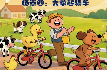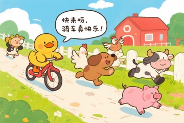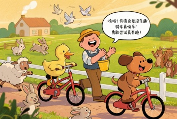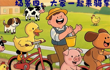 场景四:大家一起骑车 (农夫提着水桶上场,看到鸭子骑车,笑着拍手) 农夫:哈哈!鸭子,你真会发现乐趣! 鸭子(停下自行车):农夫伯伯,骑车太好玩了,大家也想试试! 农夫(摸摸胡子):好呀好呀,我们一起分享快乐! (农夫帮着动物们轮流试骑车,母鸡慢慢蹬车,绵羊紧紧抓着车把,狗骑车差点撞到围栏,大家笑得前仰后合) 所有动物(围着自行车欢呼):骑车真快乐!勇敢尝试真有趣!