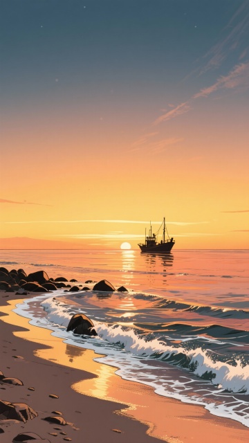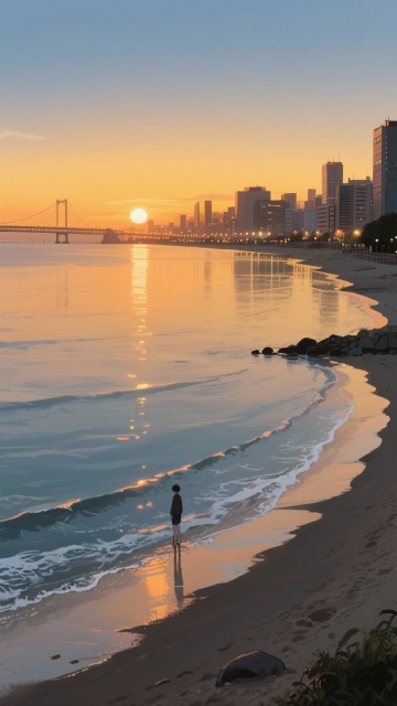 二次元,城市海边夜晚黄昏,氛围回忆,暖洋色,不要人物,细节丰富,9:16,生成二张