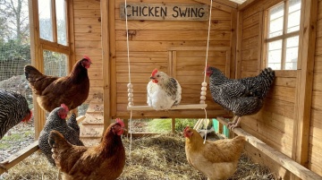 美式庭院场景,中央放置小宠围栏,围栏内几只兔子正在玩耍,背景是美式风格的建筑物并适当虚化,庭院中有草坪、花卉和休闲桌椅,阳光明媚,整体氛围温馨自然