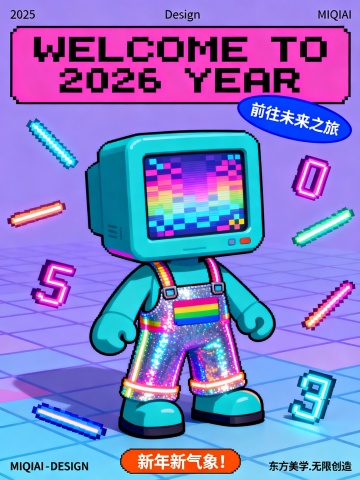 参考图1色调和风格,生成潮流扁平插画风格商业海报,橙红色纯色背景,黄色拟人角色,身着蓝白条纹 oversize 衬衫,坐在彩色几何块拼接的长椅上,双腿交叠,右手托腮,左手拿彩色棒棒糖,画面上方蓝色矩形条内粉色艺术字 “HAPPY NEW YEAR”,右侧粉色矩形条内黑色文字 “新岁启封,美好常在”,左上角彩色圆点装饰,右下角绿色圆形贴纸内文字 “@MIQIAI”,底部白色矩形条内黑色文字 “2026.01.01 新年快乐”,文字布局对称且富有节奏感,纯矢量扁平美学,高饱和度撞色,无肌理无渐变,Mengxuan Li 风格,Malika Favre 风格,Yukai Du 排版逻辑,极简几何图形,商业海报构图,视觉干净明快。
