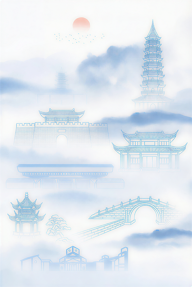 给我生成一副温州标志性建筑群的剪影,蓝色渐变详情