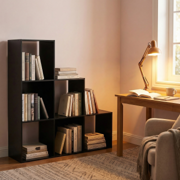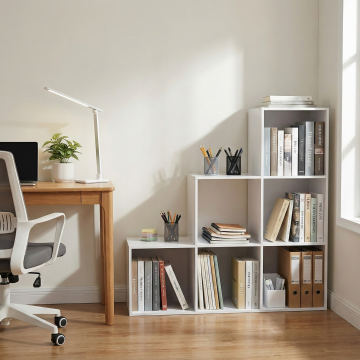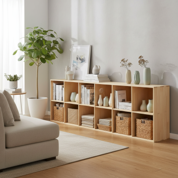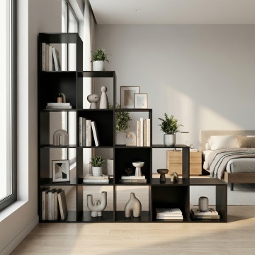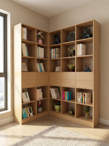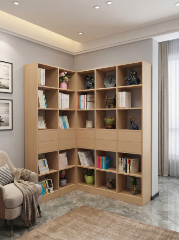 这是一个15格L形收纳储物柜 可以放置书本 或者收藏品 用于卧室 客厅 书房 突出显示产品 生成三张1600*1600的亚马逊场景图
