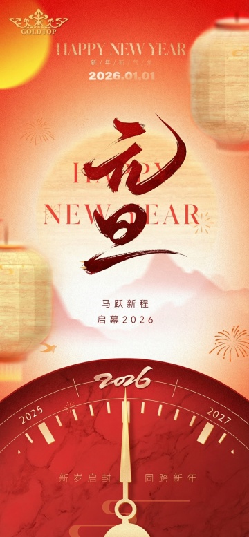 设计一张海报,主体颜色是红色和bulingbuling金黄色,正上方金黄色大大的“元旦快乐”文案,背景有灯笼烟花和不规则的闪金色底纹,一个马生肖的插画放在图的右下方,“2026”文案放图下中的位置,整体海报呈现新年气派,画面整体看着协调流畅
