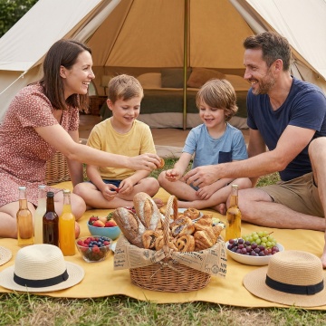 帮我做一张露营 带三个外国人 在草坪上玩 桌面放着产品以及放着很多饮料 果汁 蔬菜汁